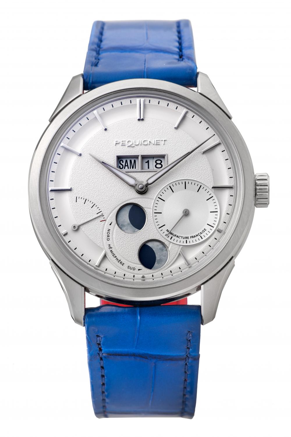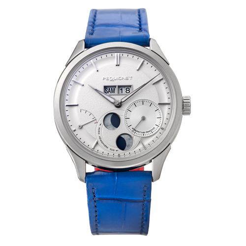 特徴:スモールセコンド、パワーリザーブ表示、フラット3ディスク・ジャンピングデイデイト(操作禁止時間帯なし)、ダブルムーンフェイズ