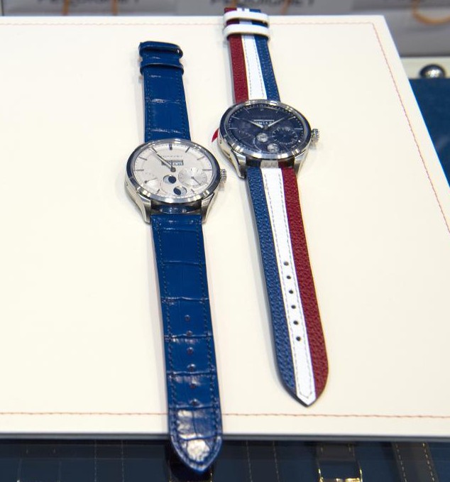 フランスメーカーならではのセンスで、独特の粒模様を際立たせたピンクのガルーシャ・ストラップや、フランスの三色国旗をイメージしたトリコロールなど、バラエティ豊かなストラップが並びます。