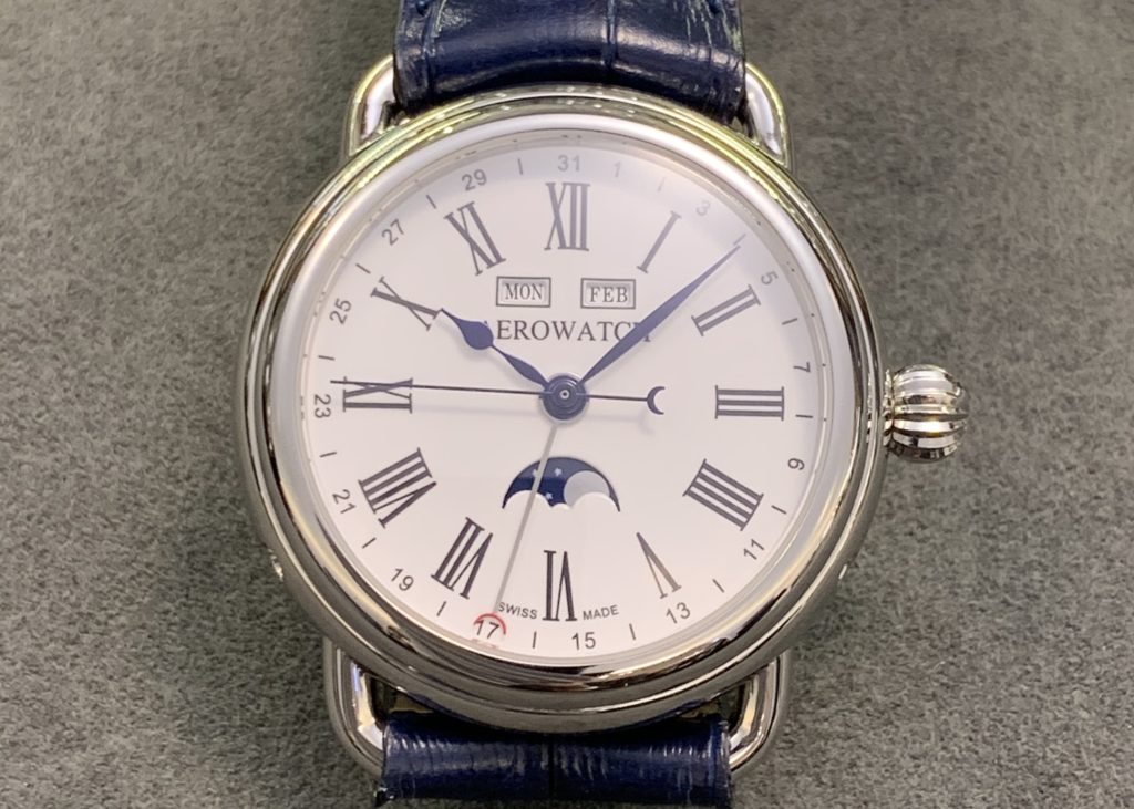 銀座三越店で開催中の「ムーンフェイズフェア」では、ムーンフェイズ搭載の腕時計を各種揃えておりますが、今回はそのなかからスイスのメーカーである<AEROWATCH/アエロウォッチ>をご紹介いたします。