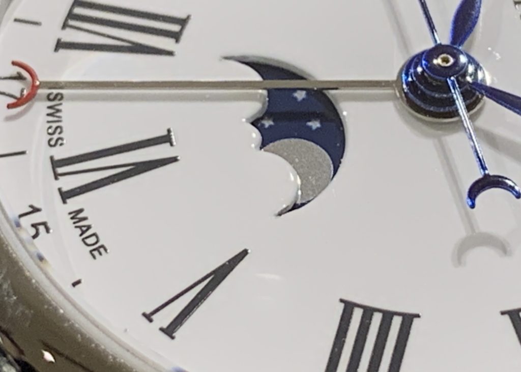 秒針の影やポインターデイトも三日月のような形をしているところがさり気なくてグッときます。