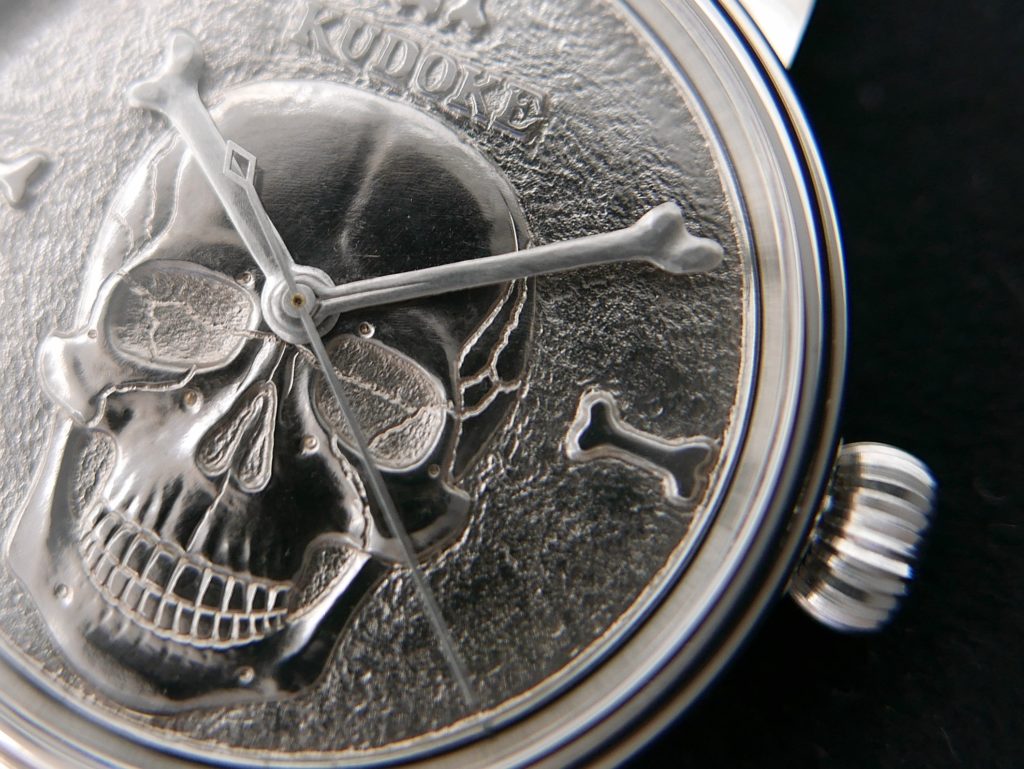 スケルトン文字盤を用いて表現することが多いKUDOKEの時計の中で異質なのがこのスターリングシルバーに直接エングレービングを施した文字盤。