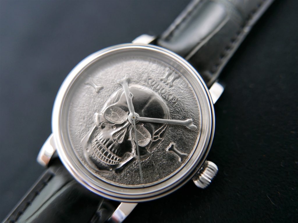 その条件下で微妙な高低差をつけ、スカルの陰影をしっかりと表現できるクドケ氏の技術力の高さをあらためてこの時計から感じます。