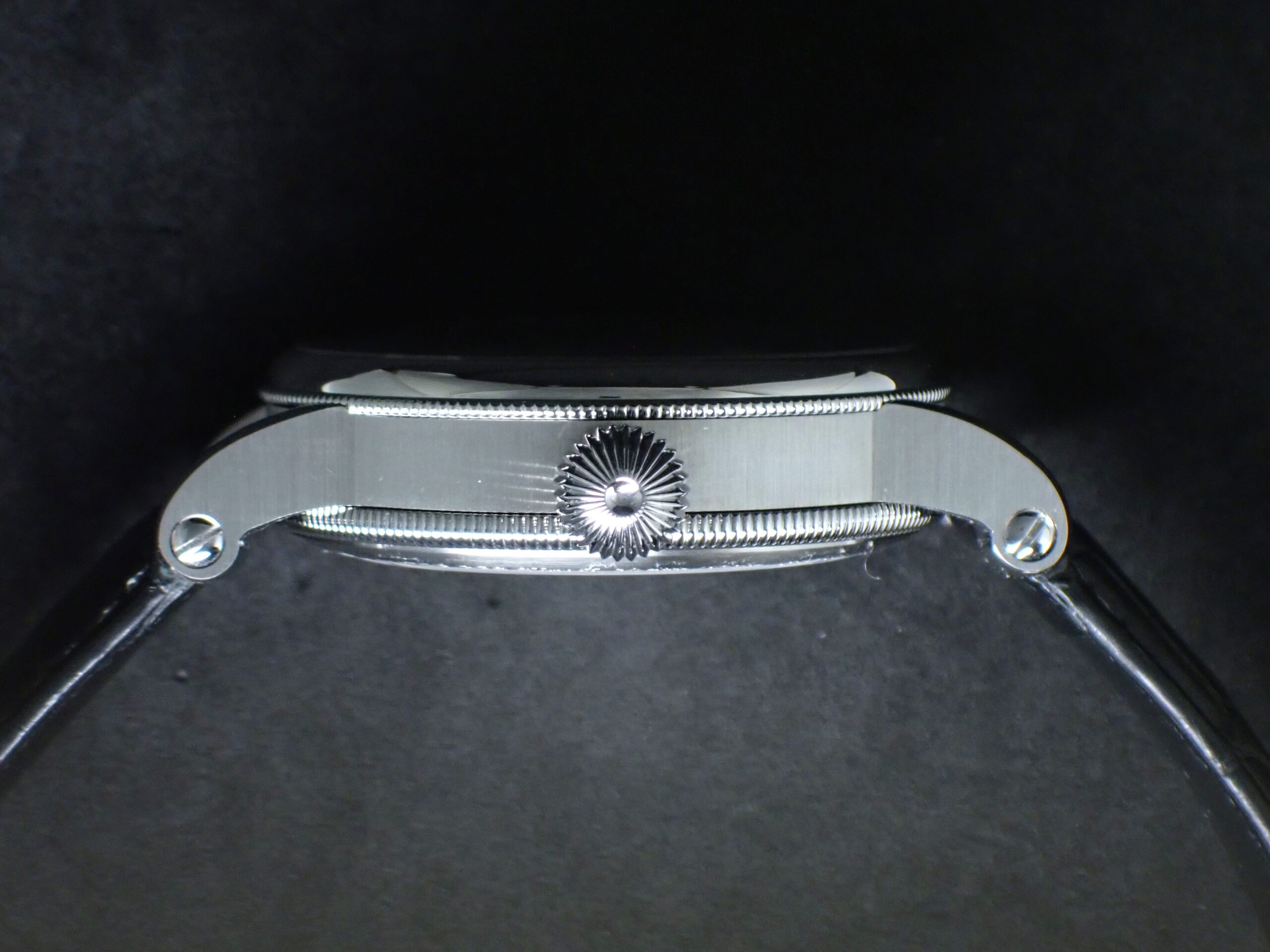 その文字盤は、規則正しい間隔で彫り込まれた曲線ギョーシェが見所のひとつです。同メーカーは1924年製のギョーシェマシンを用い、熟練した職人の手作業によって一線ずつ丁寧に削りだしています。手作業ならではの精密でエッジの効いた彫刻は、ルーペでご覧いただきたい芸術的な仕上がりです。