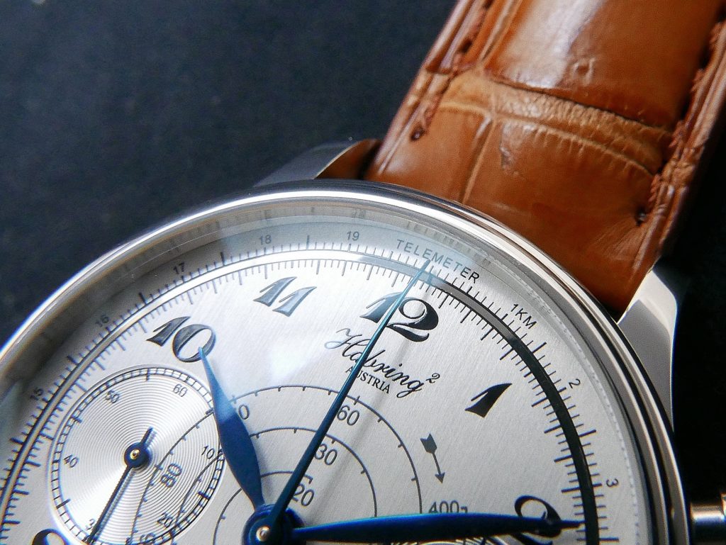 ヘアラインが施された文字盤上にはスネイルタキメーターと外周のテレメーターが備わりオールドクロノグラフらしい美しいデザインに仕上がっています。