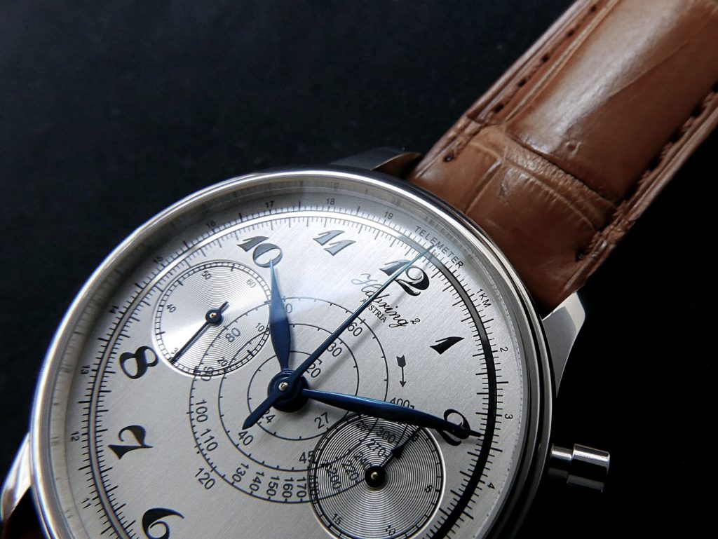 30~40年代のクロノグラフの特徴でもある肉厚ケースにブレゲ数字とボリュームのある青焼きリーフ針。