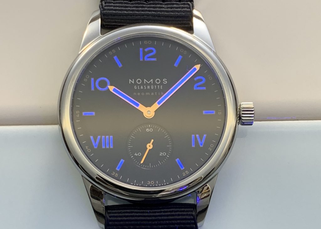 それが、こちらのクラブキャンパスです。このモデルはノモスが「新たな門出」をお祝いするために提案された時計になります。ローマ数字とアラビア数字を組み合わせたユニークダイヤルは多言語を用いて世界へ羽ばたいてほしいというノモスなりのメッセージが文字盤上で表現されています。