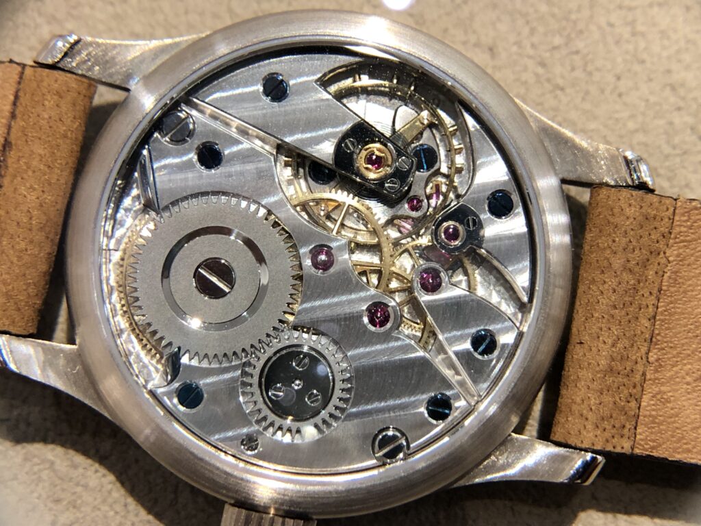 ムーブメントはヴィンテージの名機を元に作成されています。元々のパーツはごく一部のみ使用され、各パーツの磨きはそのどれもが一つ一つ美しく仕上げられています。ルーペでの鑑賞にも耐えられる数少ない時計の一つではないでしょうか。