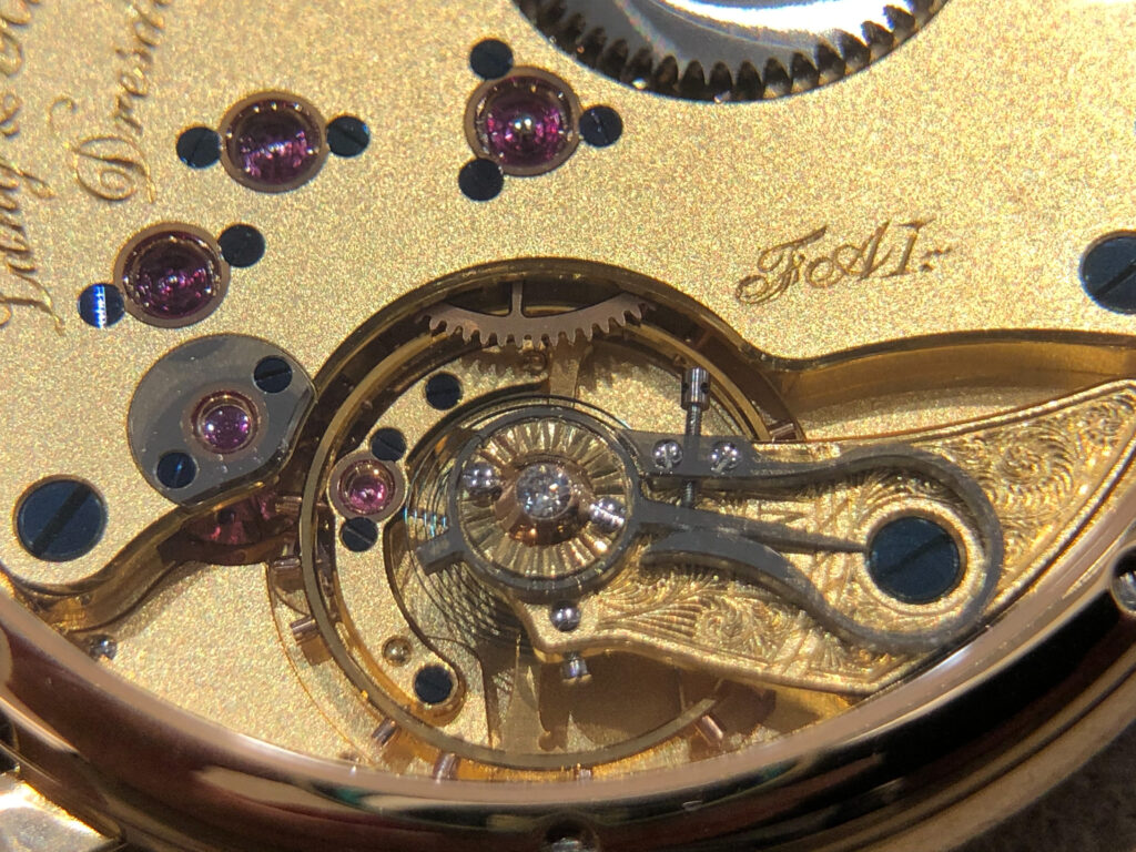 テンプ受けには繊細な彫金が施され、受け石のキャップにはカットされたダイヤモンドが用いられています。磨き上げられたスワンネック緩急針、テンプもチラネジ付き、細かな所ではガンギ車の受けを金属の別パーツで覆うなど、かつて作られたハイグレードな懐中時計の仕様が随所に用いられています。外から見られる文字盤側とは違い、ムーブメントの美しさは所有者のみ許された愉しみと言えます。
