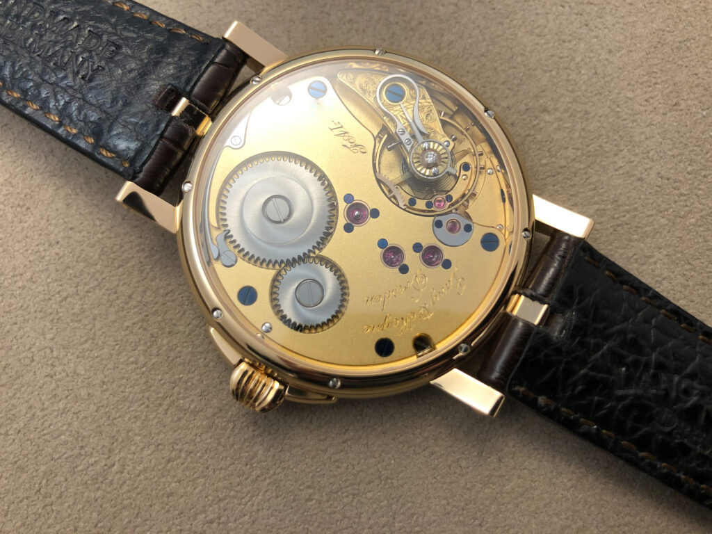 ムーブメントの仕上げも古典的なドイツ時計の仕上げを現代で再現しています。梨地の金メッキを施したムーブメントは、一般的なサンドブラストを用いた仕上げとは異なり、銀のしごきと呼ばれる手作業で仕上げられています。一括りに梨地と言っても、同じくドレスデンで時計作りを行うクドケの時計など、仕上げ方法の違いにより、それぞれ仕上がりや見え方が全く異なります。見比べてみるのも一興かもしれません。