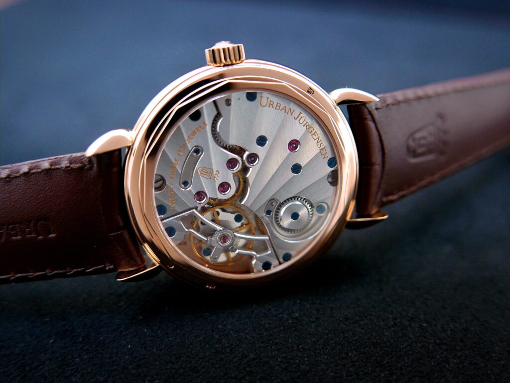 ムーヴメントは独自キャリバーの【P4】。クロノードのジャン・フランソワ・モジョンによって製造されたウルバン ヤーゲンセン専用のキャリバーです。ツインバレルにより最大72時間のパワーリザーブが確保されています。地板のカットの曲線が美しく、しっかり面取りがされ丁寧に仕上げが施されています。量産機では決してみることができない優雅な仕上げはこのムーヴメントは精緻なハンドメイドの技術を雄弁に物語っています。