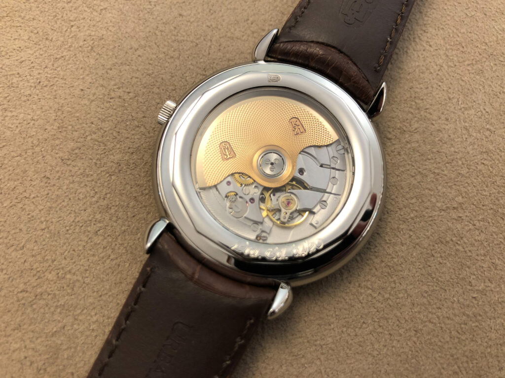 ムーブメントはフレデリック・ピゲのcal.1160を使用。比重の重い21金を用いたローター部分にも非常に細かなギヨシェの装飾が施されています。フレデリック・ピゲのムーブメントは汎用ながら高級機であり、安定したムーブメントと言えます。
