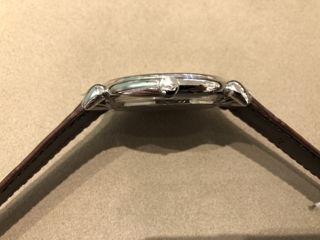現在定番となるref.1140より1世代前のモデルとなるref.8は、自動巻きのモデルながら、そのケースの薄さとクラシックなデザインから根強い支持を集めるモデルです。日本限定のこのモデルでは、彼らの特徴ともいえる、針、インデックスを堪能できます。