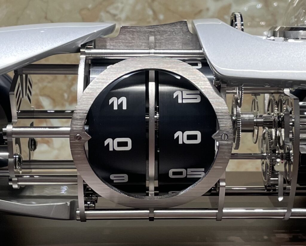自社製機械式ムーブメントのゼンマイ巻き上げはタイヤを後ろに動かすことによって行います。タイヤは前にも動かせますので、前後に行ったり来たりすることが可能です。TIME FASTは遊び心とレペの高い技術力が融合した作品です。ユニークなコンセプトというだけではなく、質の高いこだわりの仕上がりから、インテリアとしてもお愉しみいただけます。