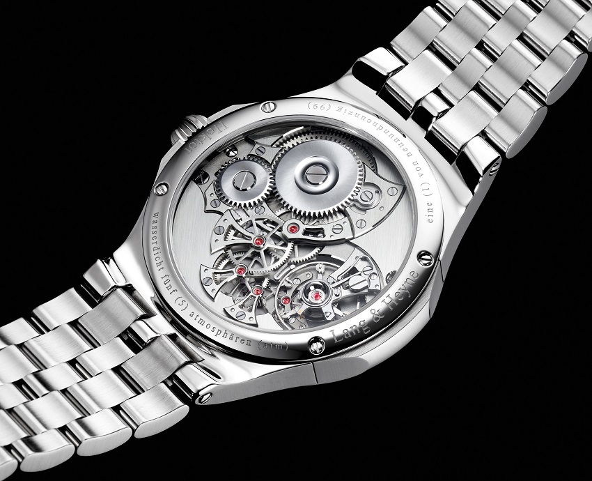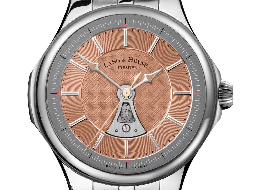 搭載キャリバー「LANG&HEYNE 33.2」は手巻きムーブメントでモダンでシャープな印象。自社開発のエキセントリック・バランスとフライングバレルによりフラットなデザインを実現しています。ダイアルの開口部と同様の「ペチコート」シェイプの受けによって可能になったオープンワークの構造が目を惹きます。
