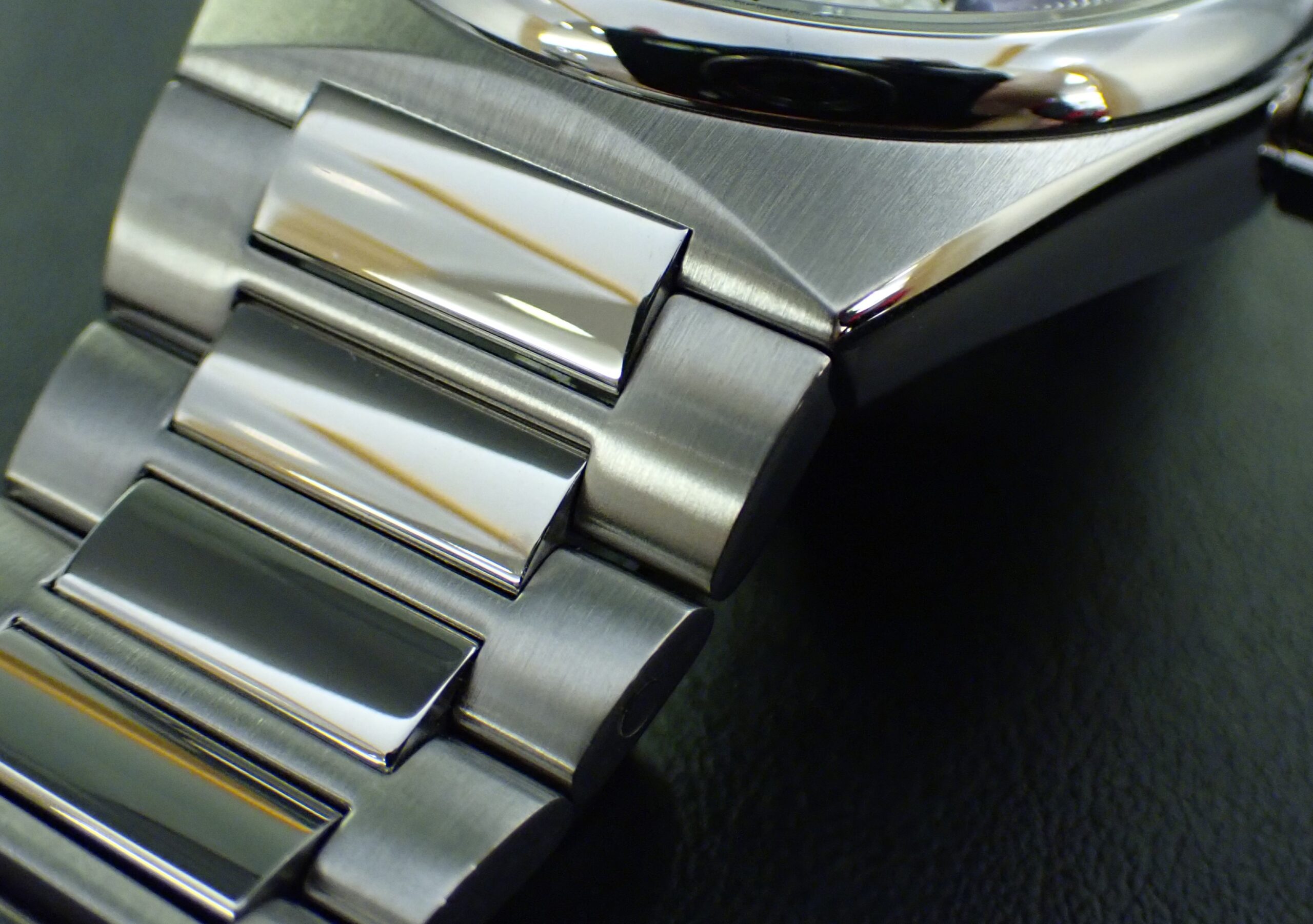 ケースはわずかに丸みを帯びており、ヘアライン仕上げとの相乗効果で、美しい曲線がお愉しみいただけます。ストラップまで流れるような一体感あるデザインは、お手に取ってご覧いただきたいポイントの一つです。