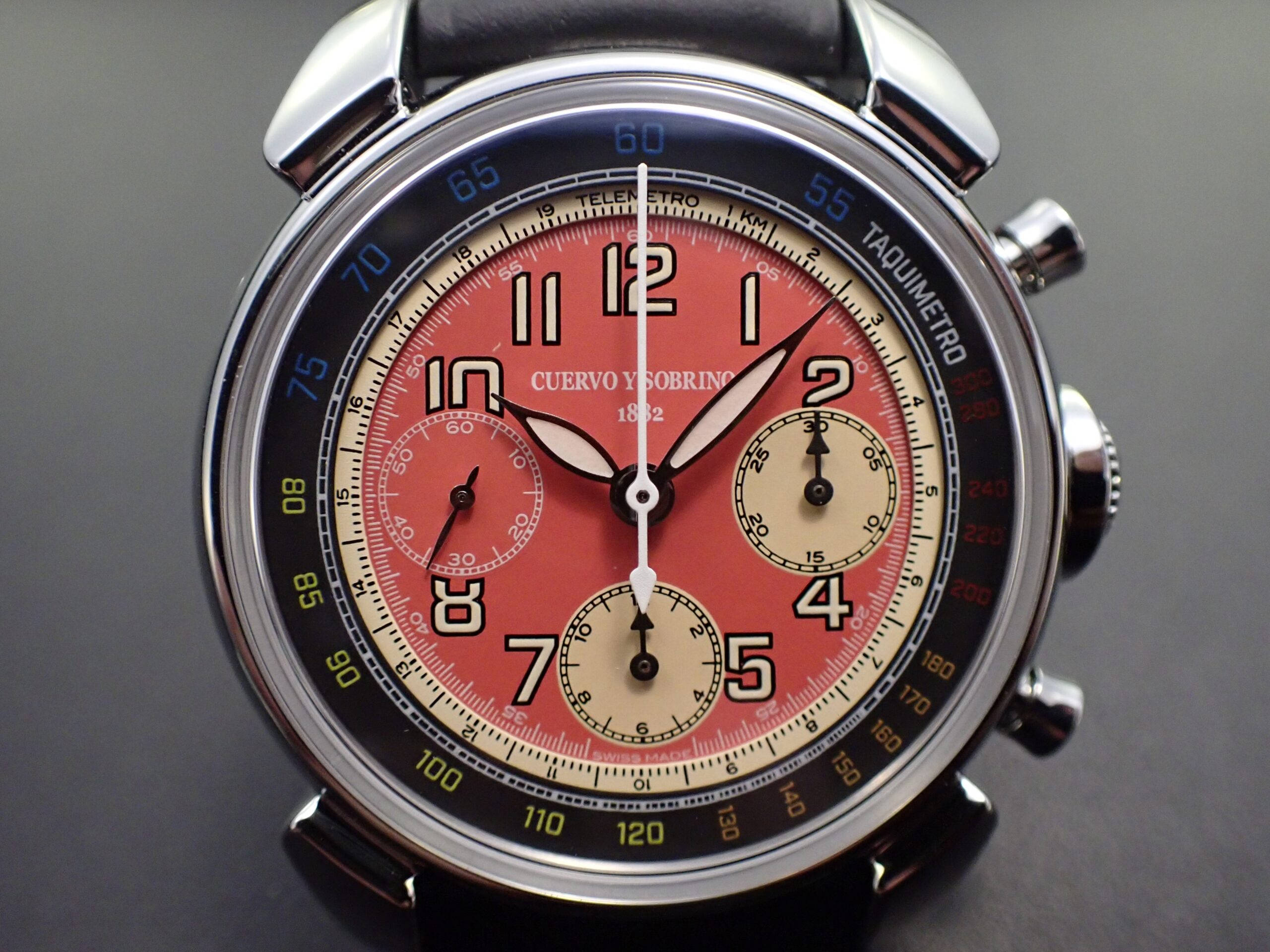 クロノグラフを用いて自動車などのおおよその平均時速を計測するタキメーターと、2つの離れた地点間の距離を計測するテレメーターが搭載され、カーレースとのコラボレーションモデルらしいデザインとなっています。カラーリングはクエルボが得意とするヴィンテージの雰囲気を感じさせるものとなっており、キューバの街並みで見かけるクラシックカーを想起させます。