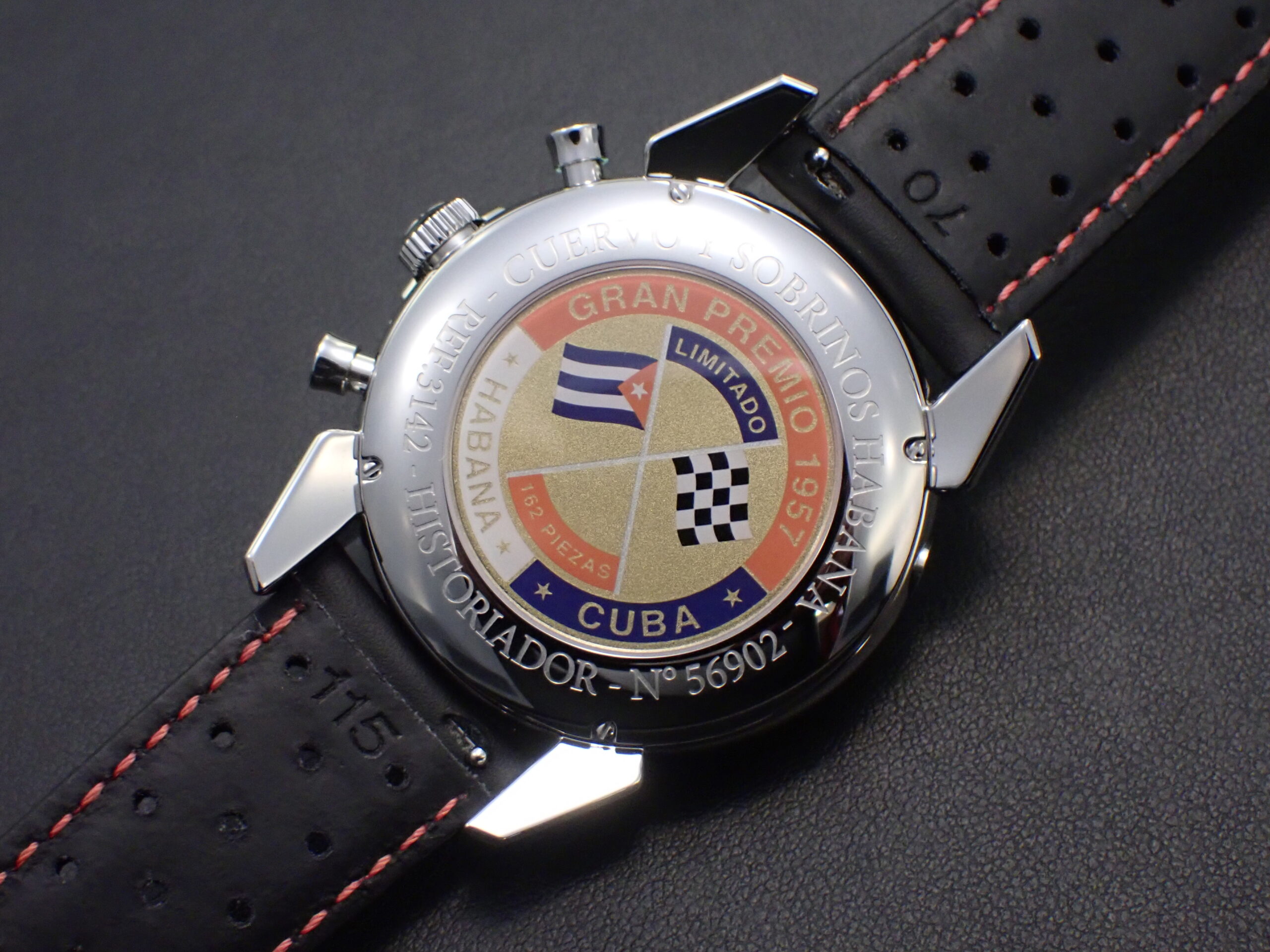 キューバの国旗とチェッカーフラッグが交差した絵が裏蓋には描かれており、ひと目でコラボレーションモデルということが分かります。キューバのスピリットが随所に見られる同モデルをぜひ店頭でご覧下さいませ。
