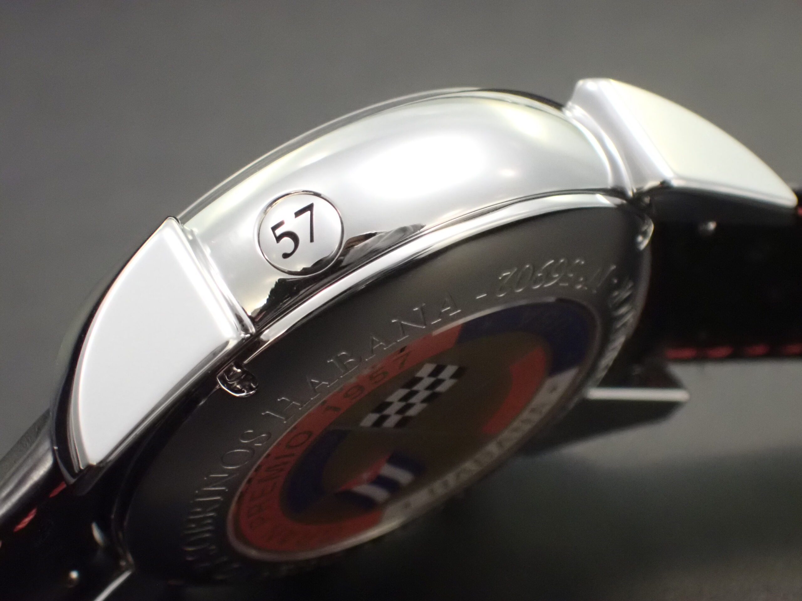 ティアドロップと猫足ラグを足したような特徴的なラグは、手首に沿うように緩くカーブしており、装着感は良好です。このヒストリアドールシリーズ特有のケースデザインは、同メーカーの1940年から50年代に発売されていたモデルから踏襲しており、今回の限定モデルでは、レースの開催年である1957年にちなんだ数字がケースサイドにあしらわれています。