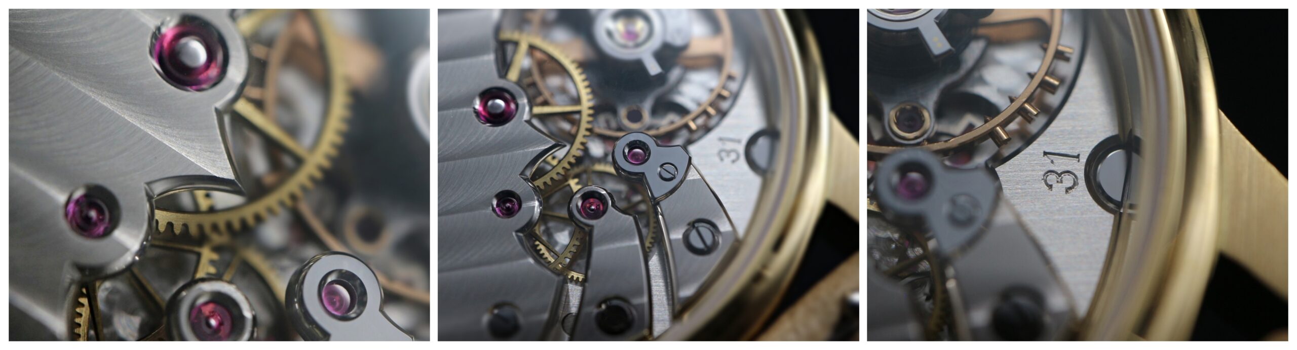 ダイヤルは伝統的なドンツェ・カドラン製のグラン・フーのブラックエナメルを使用し、18KYGのバー型のインデックスと、同じく18KYGのドーフィン針をあしらいました。非常に繊細な文字盤にアプライドのインデックスを用いることは難しく、繊細かつ高い技術力が求められます。※ダイヤルの地板は、通常シルバーや銅、真鍮などを使用しますが、今回のモデルは地板にも18KYGを使用することで、より透明感のある深いブラックに仕上がりました。