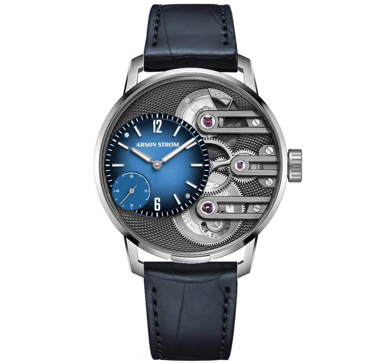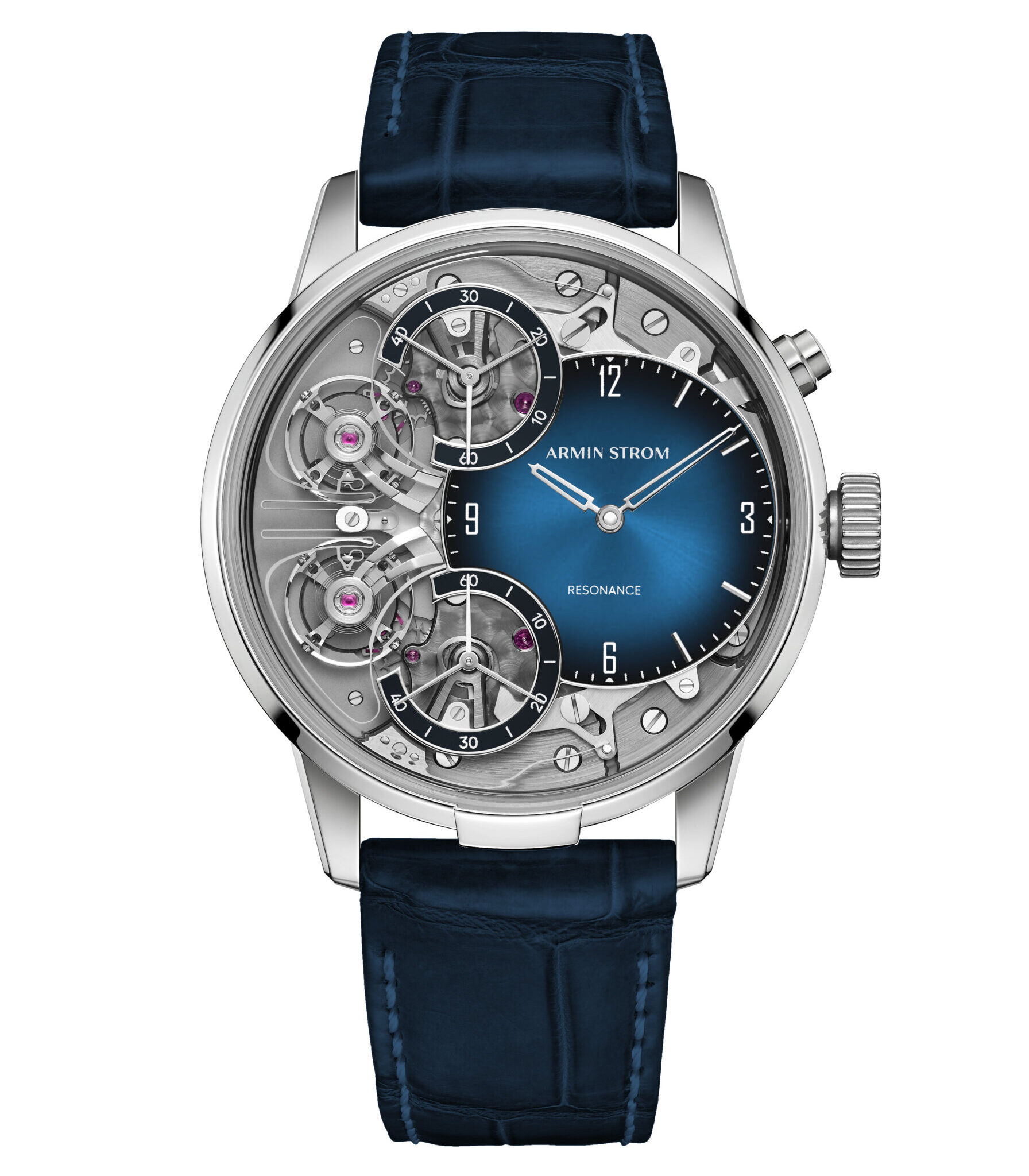 盤面左側に2つのテンプを配し、その動きを楽しむことのできるデザイン。これは特許でもあるレゾナンス・テクノロジー(レゾナンス・クラッチ・スプリング)を可視化したもので、アーミンシュトロームだからこそなしえた時計と言える。こちらのモデルもグラデーションダイヤルで「INDIGO(インディゴ)=藍」を表現。