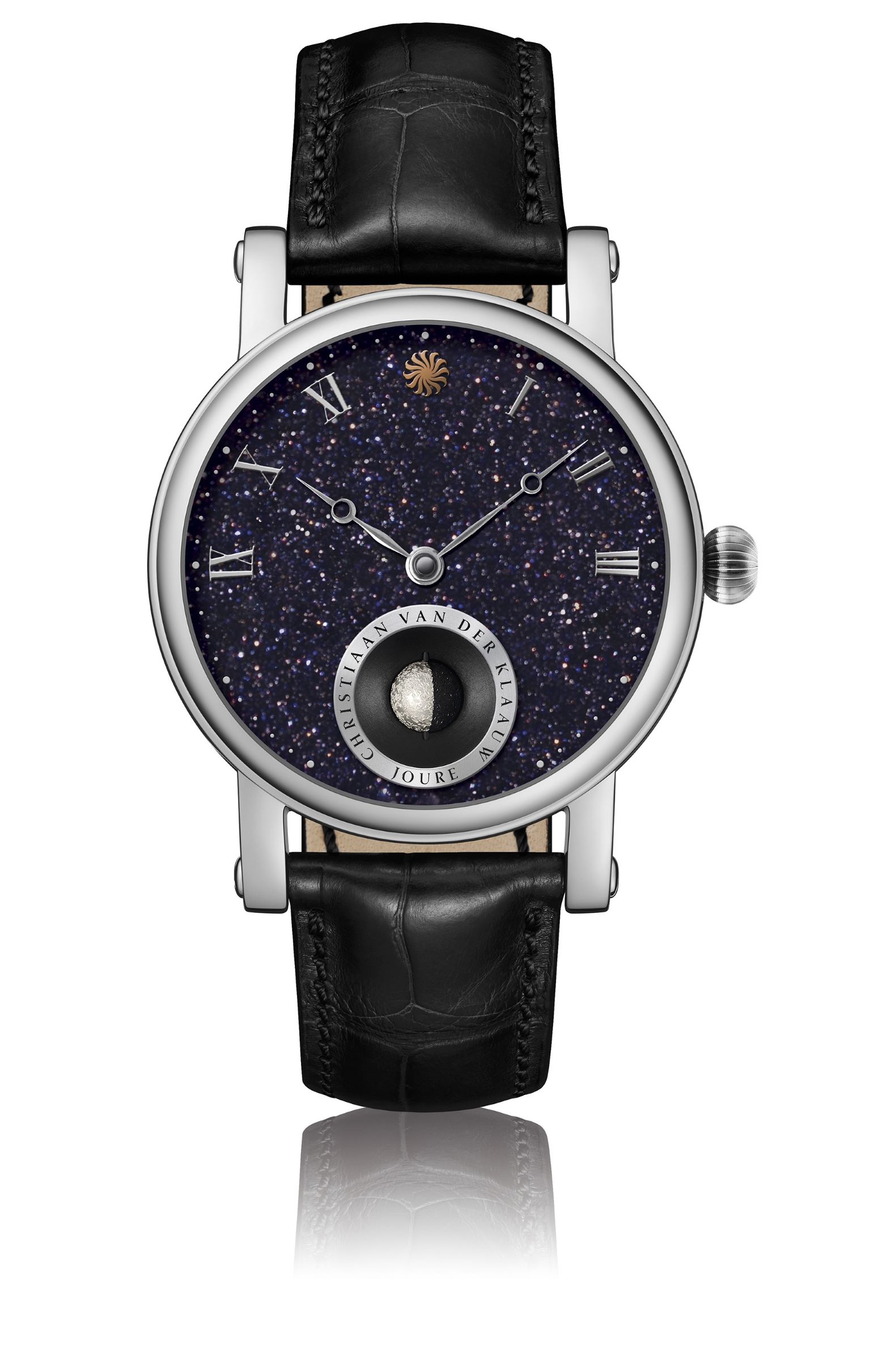 夜空を思わせる神秘的なアベンチュリン文字盤に、1万1000年に1日の誤差しか生じない、世界で最も正確と評される機械式3Dムーンフェイズを搭載。ハンドメイドで製作された6時位置のミニチュアムーンがゆっくりと月の満ち欠けを再現します。