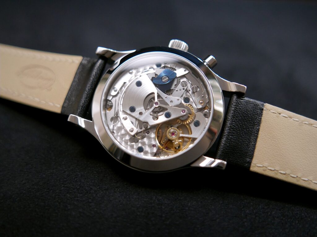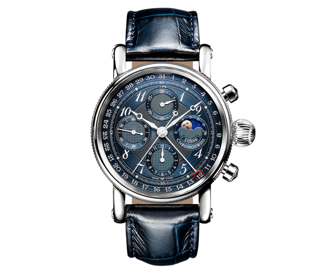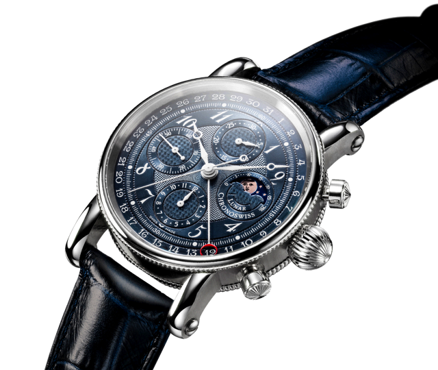 クロノグラフとムーンフェイズを組み合わせたChronoswissの複雑機構モデル。月の満ち欠けと計測機能を一つの文字盤に美しく統合しています。