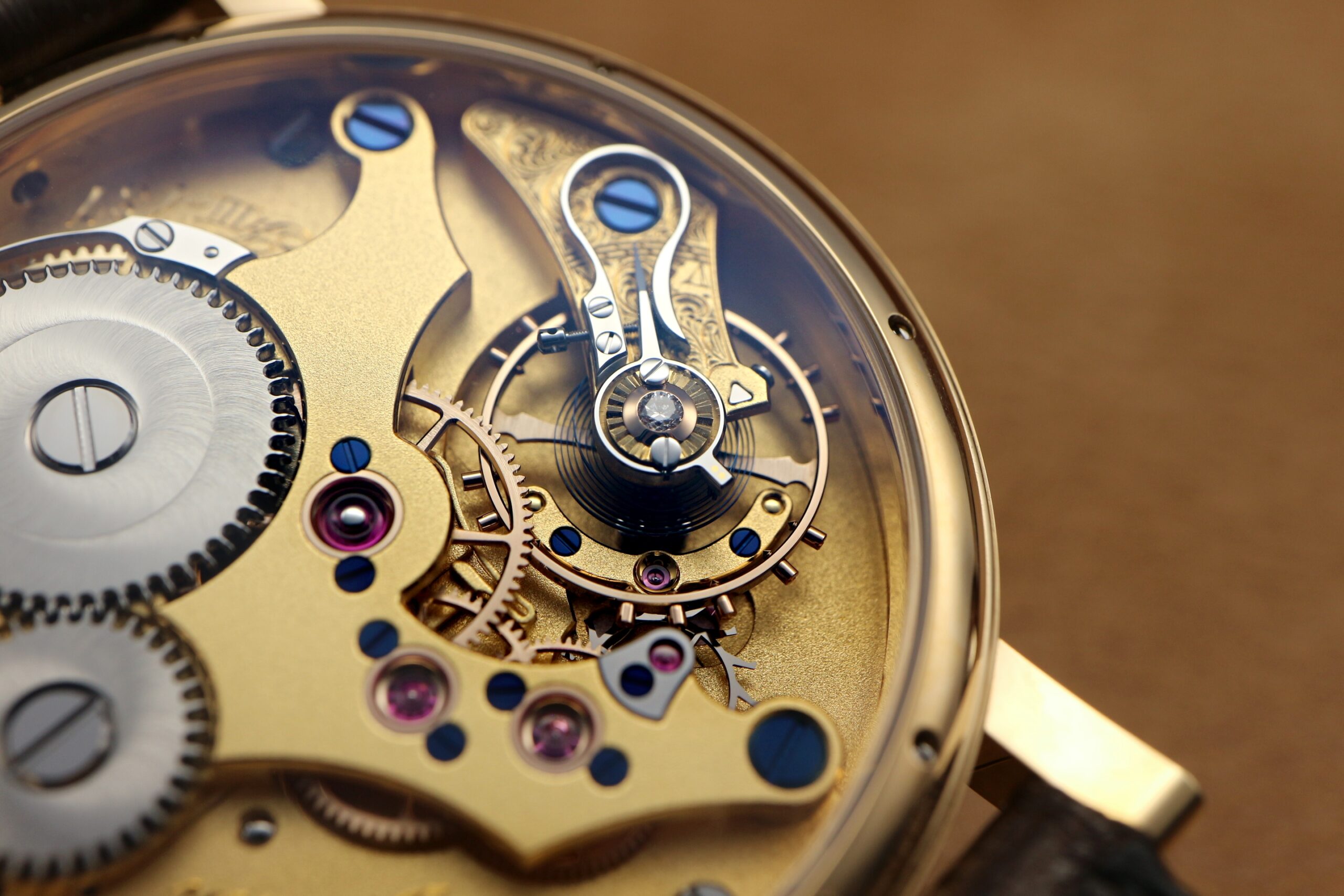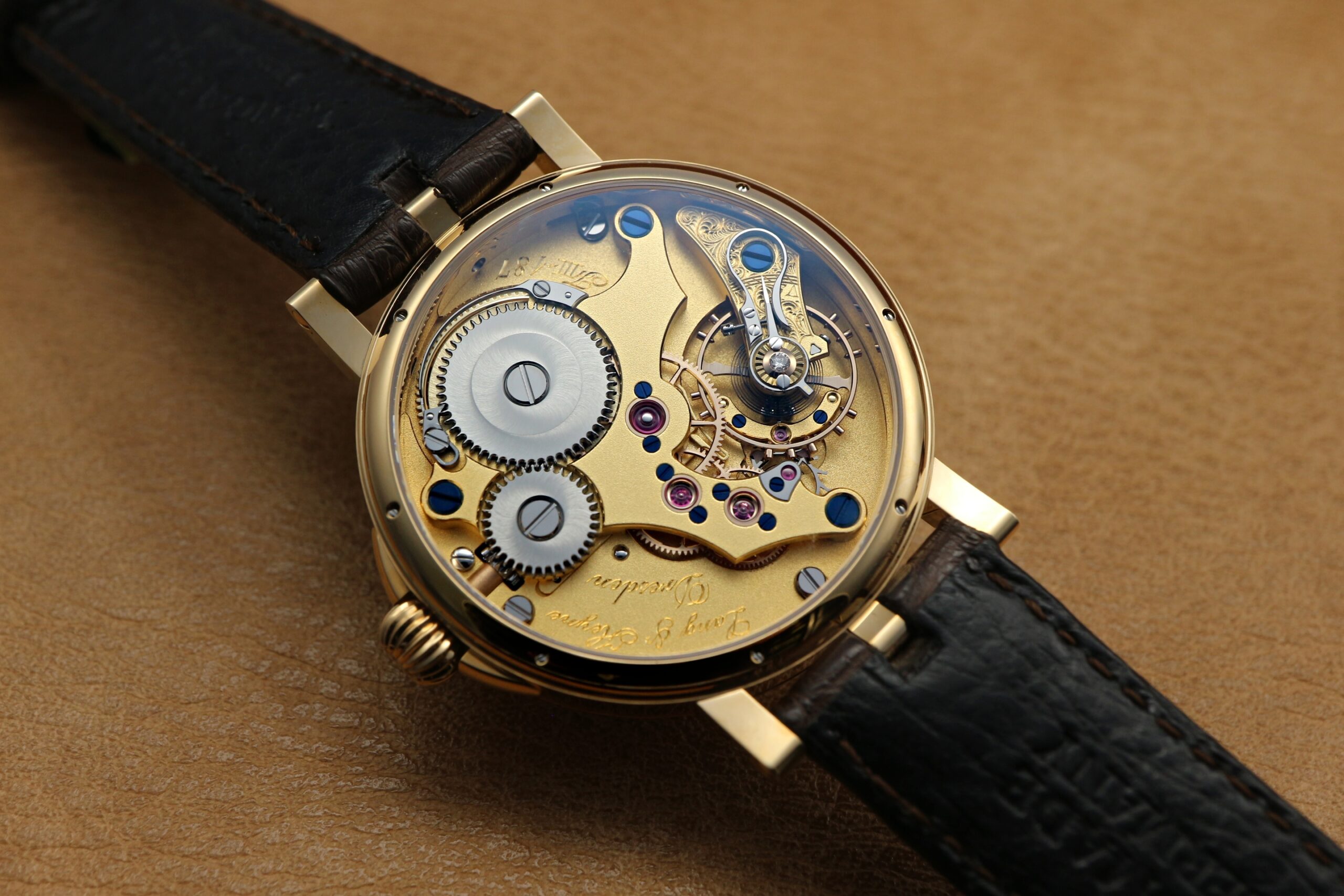 脱進機は、エングレーブが施されたテンプ受けの上に、錫研磨されたスワンネック緩急針が置かれ、天府の軸受け石の上にはダイヤモンドがセッティングされています。その他、ゴールドシャトンや、純金製のムスターシュアンクルなど、どれも18世紀から19世紀にかけて確立された伝統的技法が取り入れられています。