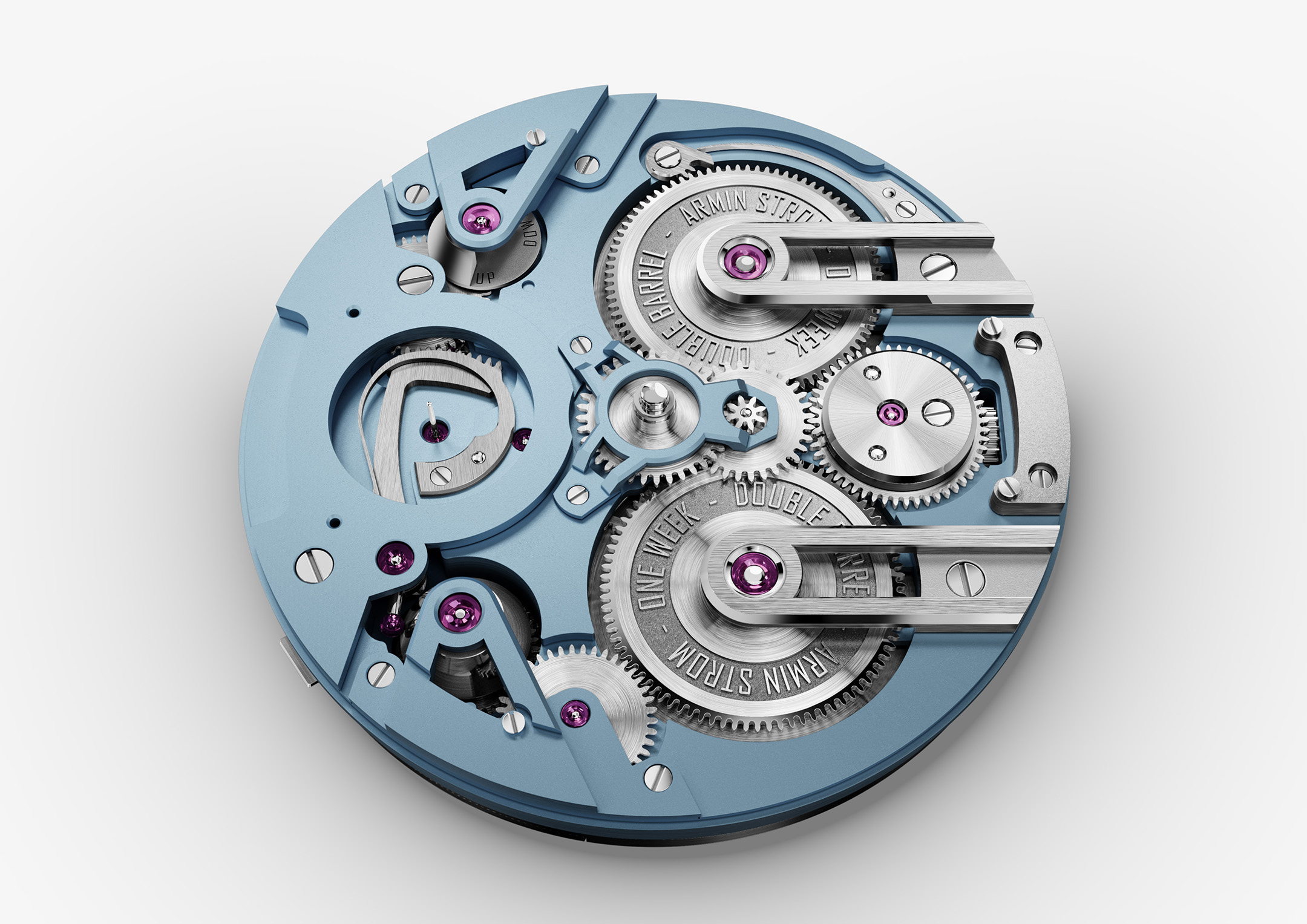 「ワンウィーク」の名が示す通り、このモデルは 7日間のパワーリザーブを誇ります。新たに開発された手巻きキャリバーARM21は、直列に配置された2つのメインスプリングバレルが、安定したエネルギーを機構へと供給。ダイヤル側から、2つの香箱真が逆方向に巻き上げられる様子を見てとることができます。これは単なる機能性だけでなく、ムーブメントの構造美を視覚的に訴えかける、アーミン・シュトロームならではの表現と言えるでしょう。