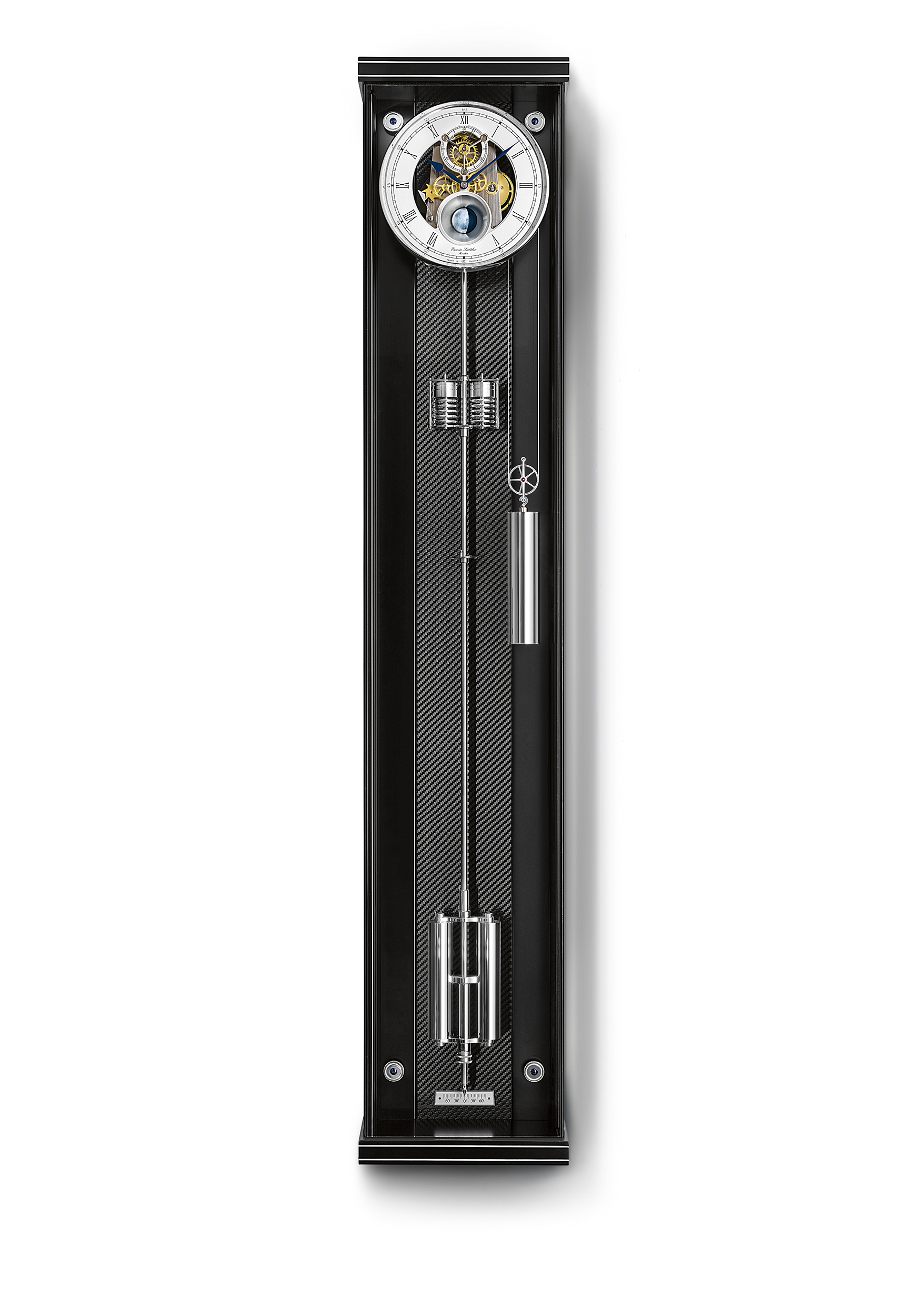 透けるようなスケルトン構造の奥に見えるのは、精巧に磨き上げられたパーツと、静かに揺れる美しい振り子。その一つひとつに職人の手仕事が息づき、球体の月齢表示はすべてハンドペイントで仕上げられています。歩度調整キットが付属されており、ご自身の手で“時”を微調整するという、時計師のような特別な体験が可能です。さらに、別売りの脚パーツを取り付ければ、ホールクロックとしてカスタマイズも可能。機能性と美しさを兼ね備えた、現代のライフスタイルにフィットする一点です。