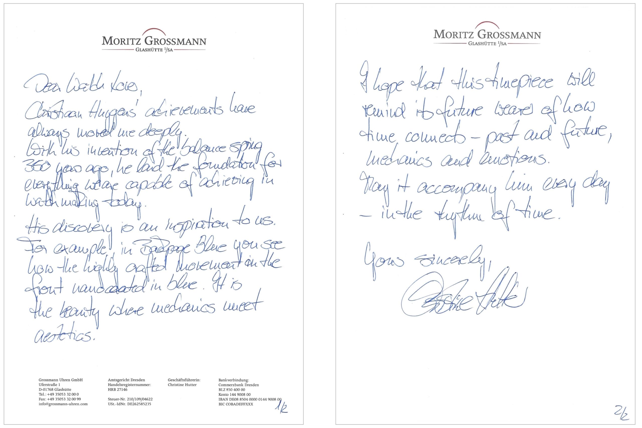 歴史的なグロスマン氏の工房は彼の死後途絶えていましたが、2008年に時計師のクリスティーネ・フッター氏が、その名と哲学を受け継ぐ形で「モリッツ・グロスマン」をグラスヒュッテの地に再興しました。彼女は、グロスマン氏が目指した「完璧な時計」のビジョンを現代に蘇らせ、伝統技術と最新技術を融合させたマニュファクチュール(自社一貫生産)ブランドを設立しました。