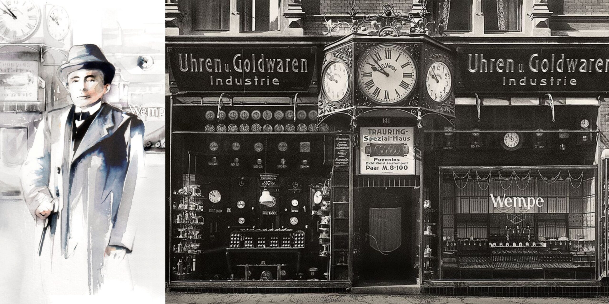 1878年55日、ゲルハルト・D・ヴェンペ(Gerhard D. Wempe)が、ドイツ北西部のエルスフレートにて、わずか80マルクを手に時計工房兼ショップを開いたのが始まりです。彼は中古時計の売買で成功を収め、「ゴールデン・ゲルト(黄金のゲルト)」という愛称で親しまれました。1907年、ハンブルクに進出し、入り口に巨大な3面時計を掲げた店舗をオープン。当時では画期的だった「統一された店舗デザイン」や「質の高いカスタマーサービス」を導入し、のちに世界的な高級宝飾店へと成長する礎を築きました。