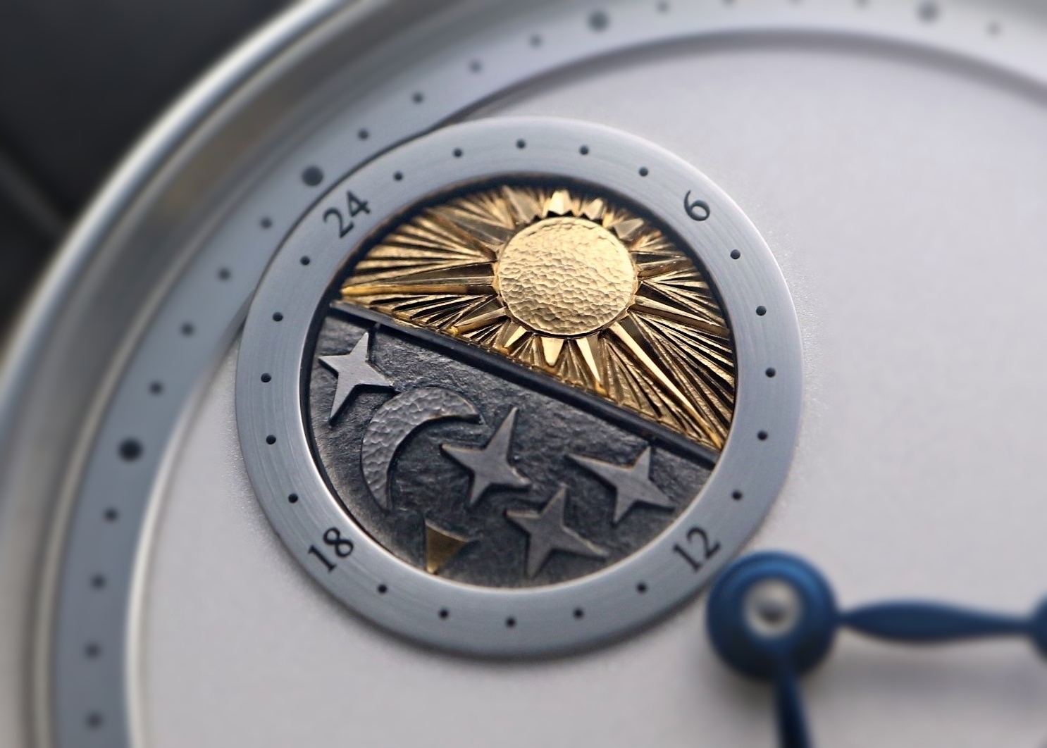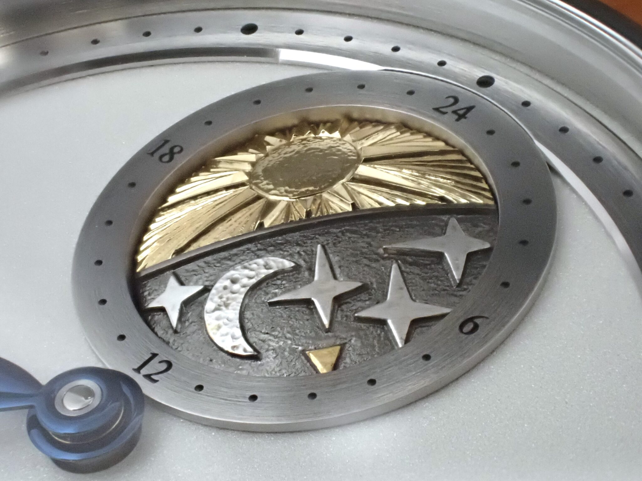 このディスクは針と連動して時計回りに回転し、月側にある三角のマークによって、午前と午後を24時間計として読み取ることが可能。