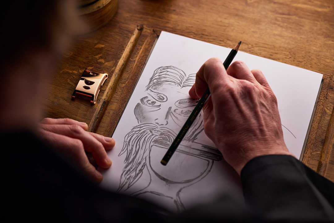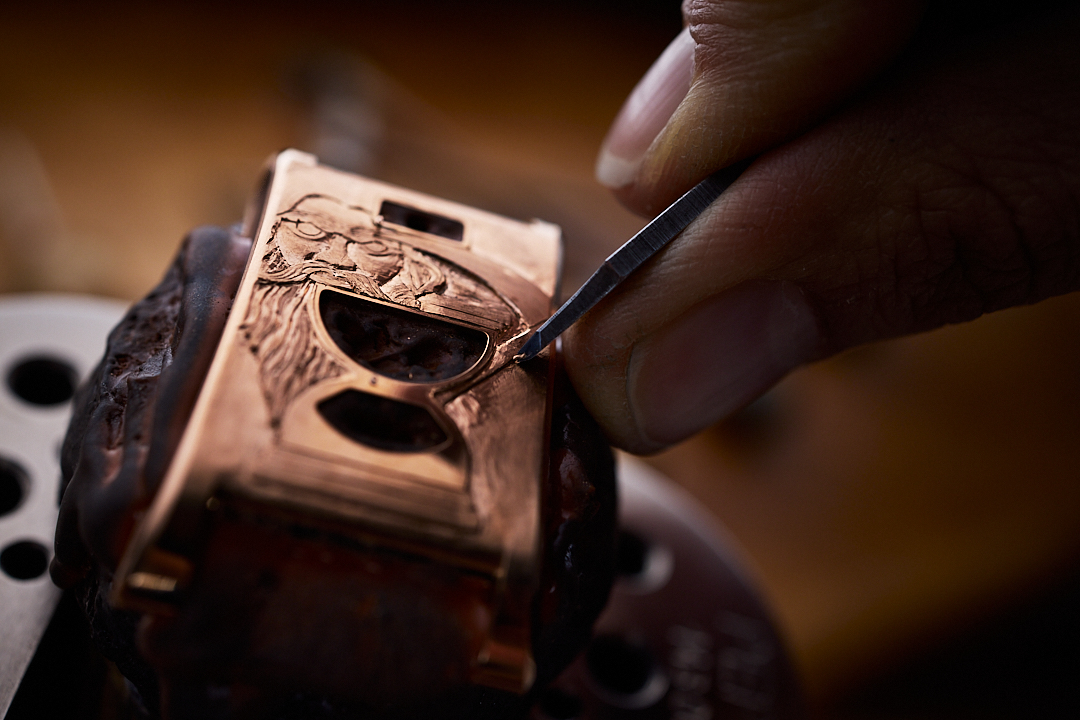 『ネオ デジター クロノス』の造形は、数週間にわたる忍耐強い手作業によって完成します。職人は伝統的なビュラン(彫刻刀)を使い、ソリッドゴールドの表面から「クロノス(Chronos)」の姿を浮き彫りにしていきます。