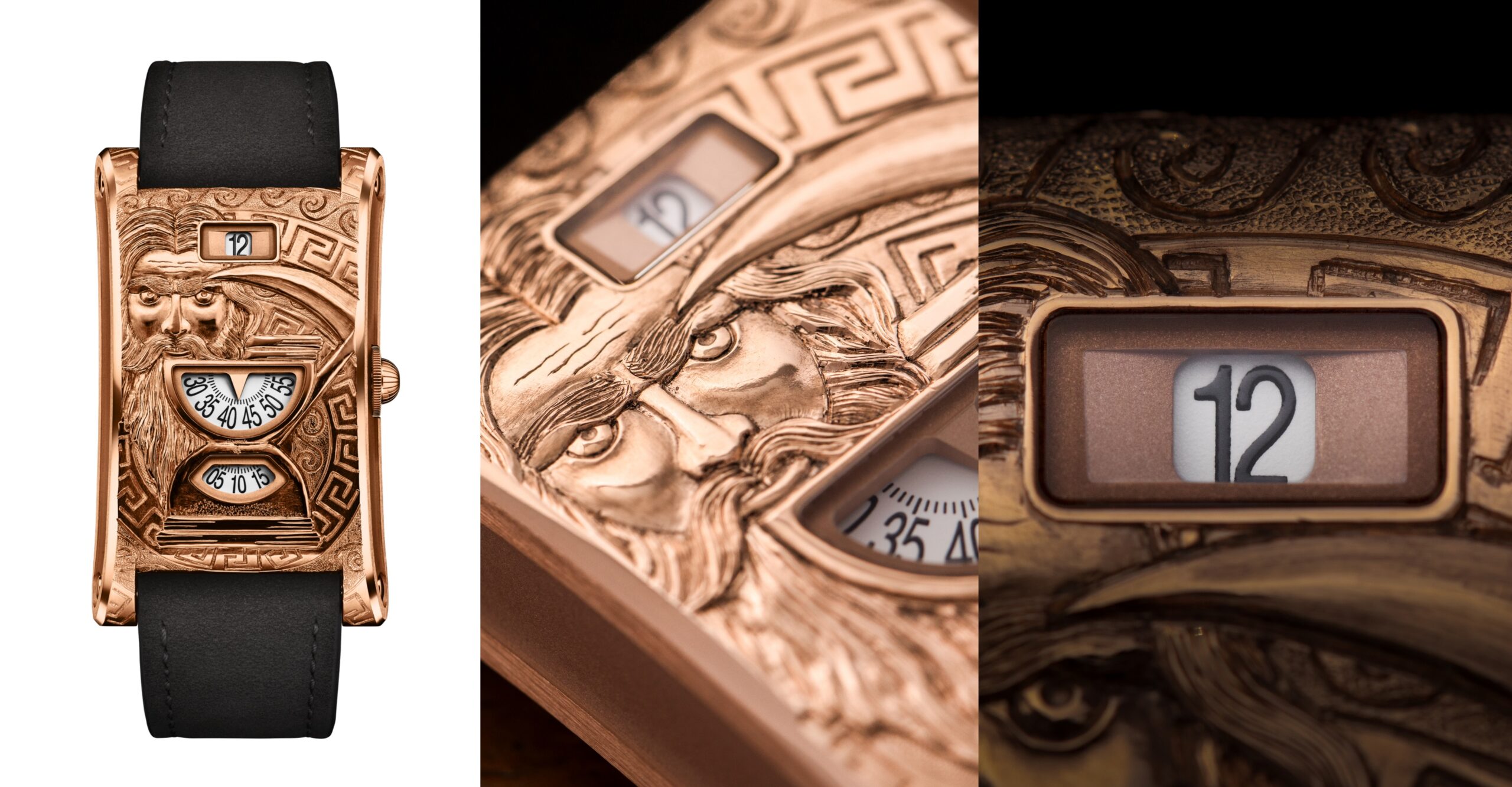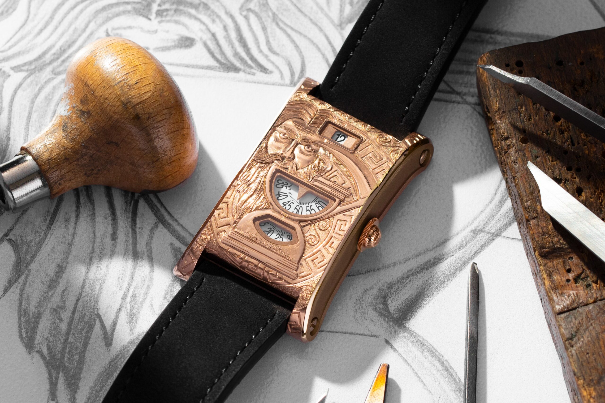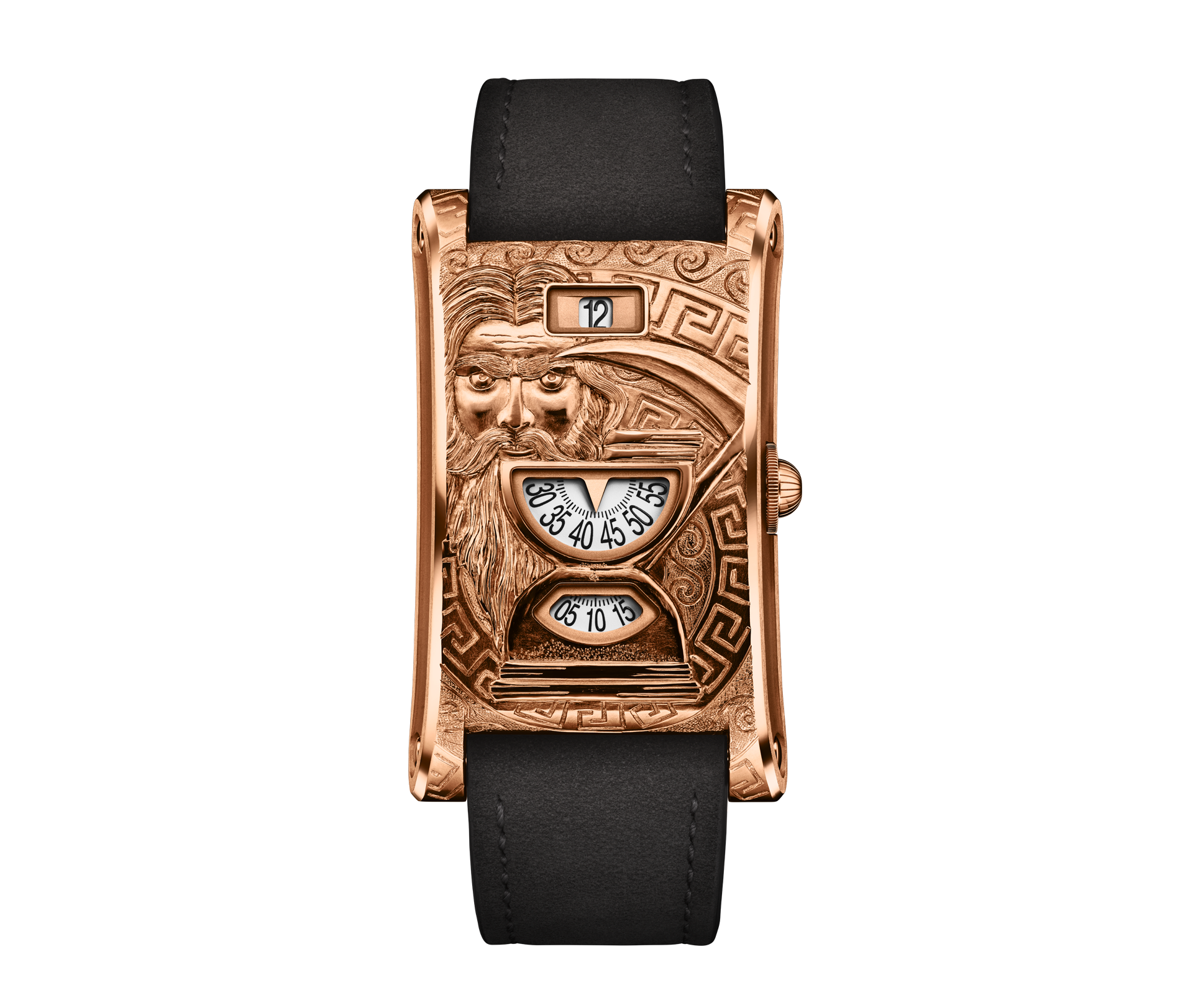 従来の文字盤を廃し、彫刻が施されたゴールドケースの開口部(アパーチュアル)から時の流れを覗かせる意匠を採用。時の番人である「クロノス(Chronos)」は、その手に砂時計を携えています。