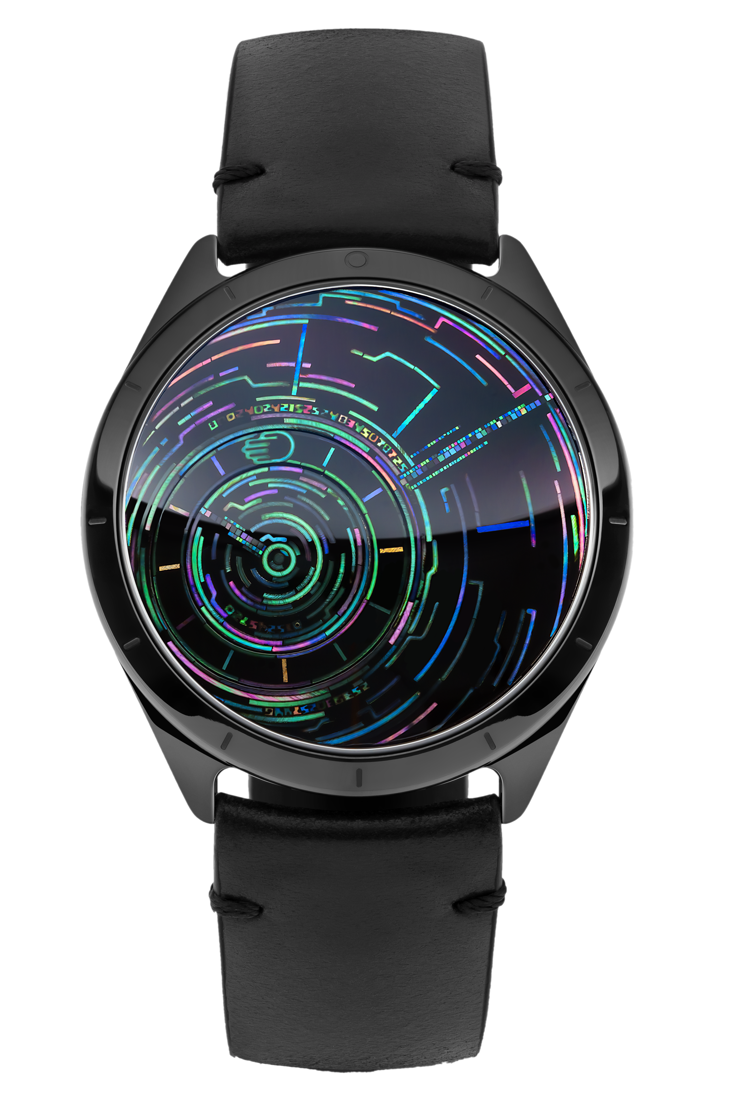 同ブランドが持つミニマルデザインをキャンバスとして、漆を複層塗り重ね、高品質の真珠母貝の殻を極限まで薄くして埋め込み、空想科学の近未来的な世界観が表現されています。